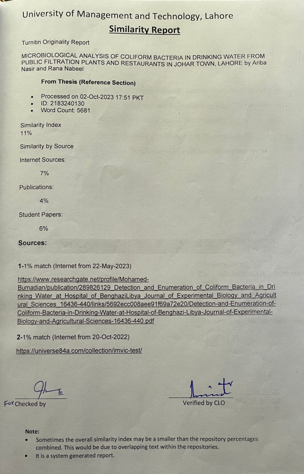 Microbiological analysis of coliform bacteria in drinking water from public filtration plants and restaurants in johar town, lahore