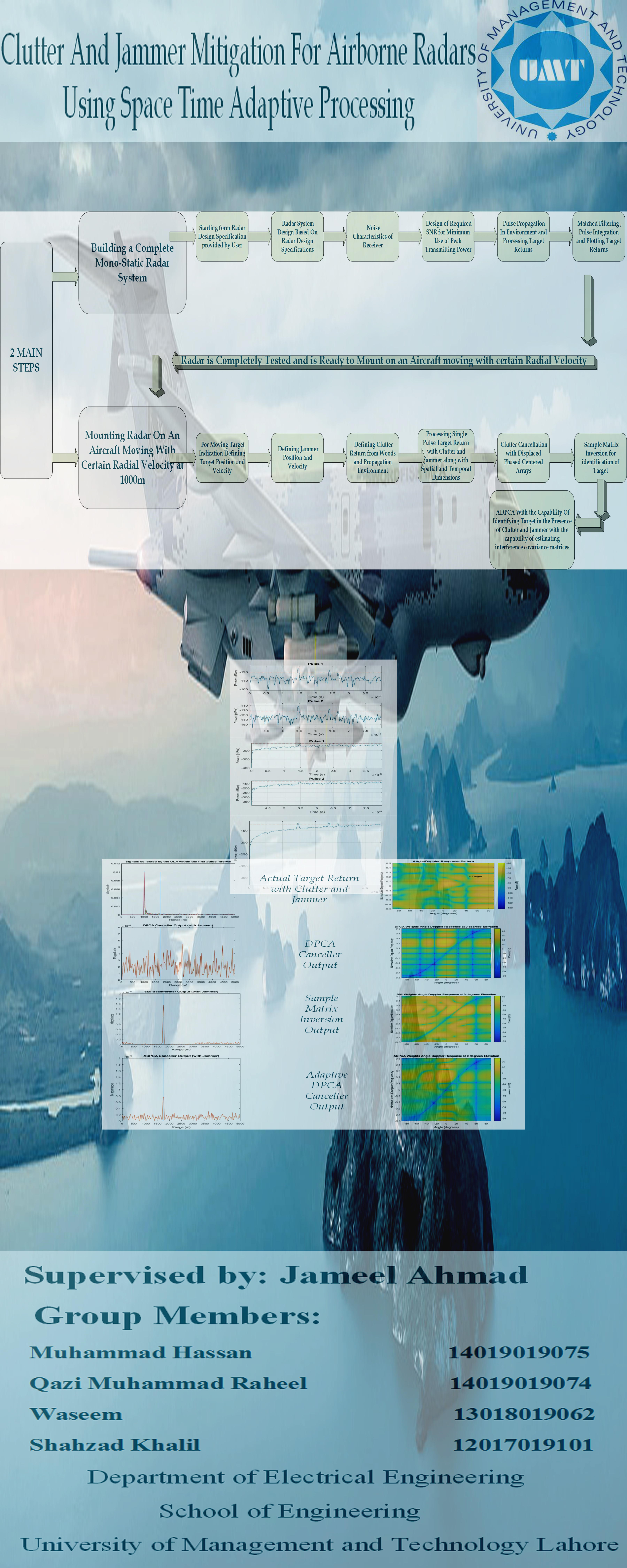 Detection of signal in the presence of noise was topic of great interest in the domain of Radar signal processing since after 2nd world war. But in that scenario the platform (Ground) itself was stationary and it was not so challenging to detect the signal in the presence of clutter or noise because clutter filtering can be easily done on the basis of Doppler shift .But in the last 20 years radar world has changed dramatically and active multichannel phased array antennas are now mostly using in every fighter plane mostly known as AESA (Active Electronically Scanned – Array radars).These Airborne radars have the capability to target any stationary or moving object one the ground . In case of targeting any moving object on the ground although the one problem is that the signal is totally embedded in noise. The second major problem is that Doppler frequency of clutter is dependent on the angle between clutter and radial velocity of Aircraft. Space time adaptive processing is the technique which filters the signal in both the spatial and temporal domain. For spatial sampling of the backscattered echo there must be multichannel phased array antenna, so the array geometry comes on account of spatial dimensions. And the 32temporal dimensions come on account of pulse trains. Adaptive processing is derived from the word 'Adaptation’. This means on account of changing nature of clutter and jammer noise there is a need to estimate the "inverse" of clutter and jammer noise space time covariance -matrix. For modeling all of these STAP algorithms current program must have to link a complete mono-static radar. So first modeling a complete mono-static radar in which based on radar design specifications radar parameters will be designed, target, transmitter, receiver and propagation environment effects will incorporate and After that linking this radar for performing space time adaptive processing.