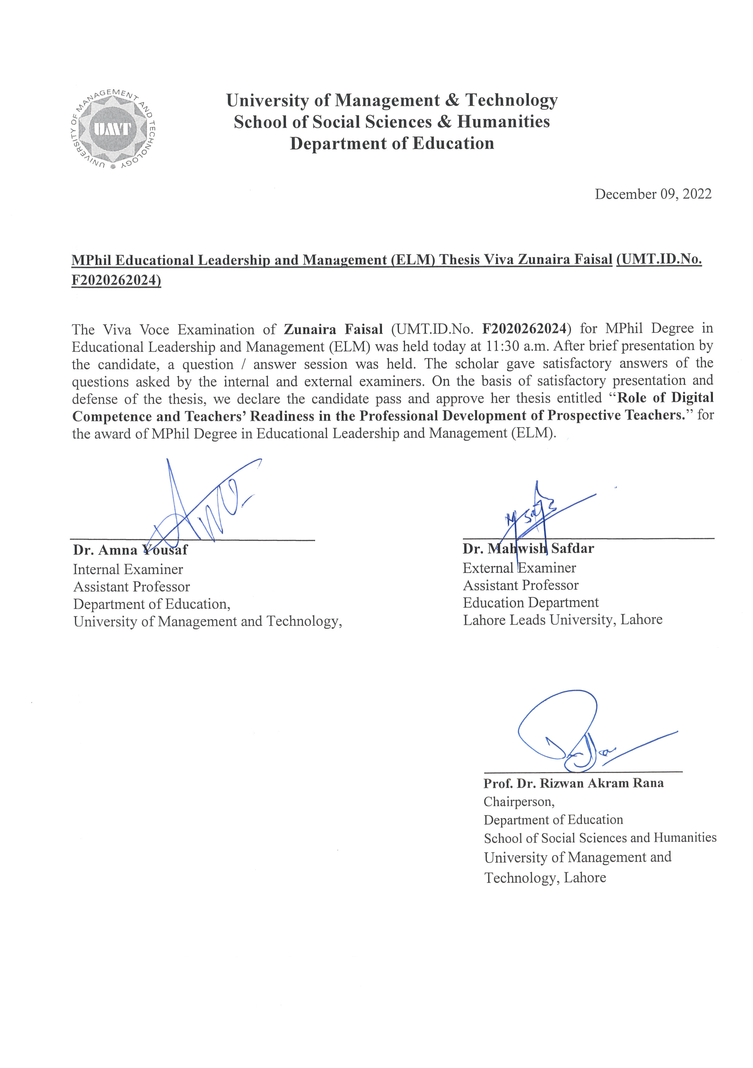This study's major goal was to investigate how teachers' preparation and digital competence relate to future teachers' professional growth. To investigate the link between the importance of digital competence and teachers' preparation in the professional development of aspiring teachers, a quantitative survey design analysis was used. Students from the University of Management and Technology in Lahore's BS Education department made up the study's population. 169 male and female University of Management and Technology students from Lahore made up the sample population. To ensure the population was as accurately represented as possible, a straightforward stratified sampling procedure was used. One poll was developed from a study on campus atmosphere. Using the statistical programme SPSS, the data gathered for this investigation were analysed. The study's findings showed that students firmly think that digital proficiency and teacher preparedness play a part in the professional development of aspiring teachers. The findings of this study also demonstrated that both men and women had different perspectives on the importance of digital literacy and teacher preparedness for future educators. With these findings, it is encouraging to think that more research may be carried out to determine the significance of digital competence and teachers' preparation in the professional development of future teachers. It is suggested that more study be done to determine the beneficial impacts of the role of digital competence and instructors' preparation in the professional development of aspiring.